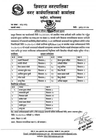 छोटो सुची (Short List) प्रकाशन सम्बन्धमा ।