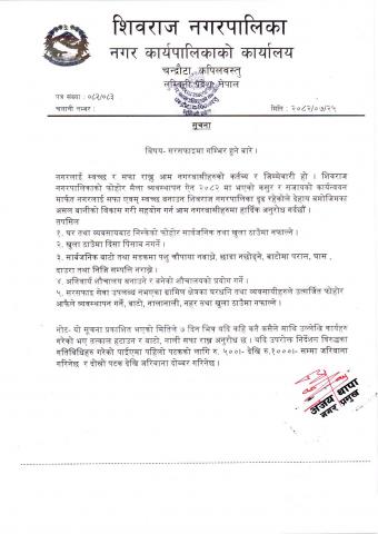 शिवराज नगरपालिकाको कार्यालयबाट नगरको सडक क्षेत्र व्यवस्थित गर्ने सम्बन्धि सूचना