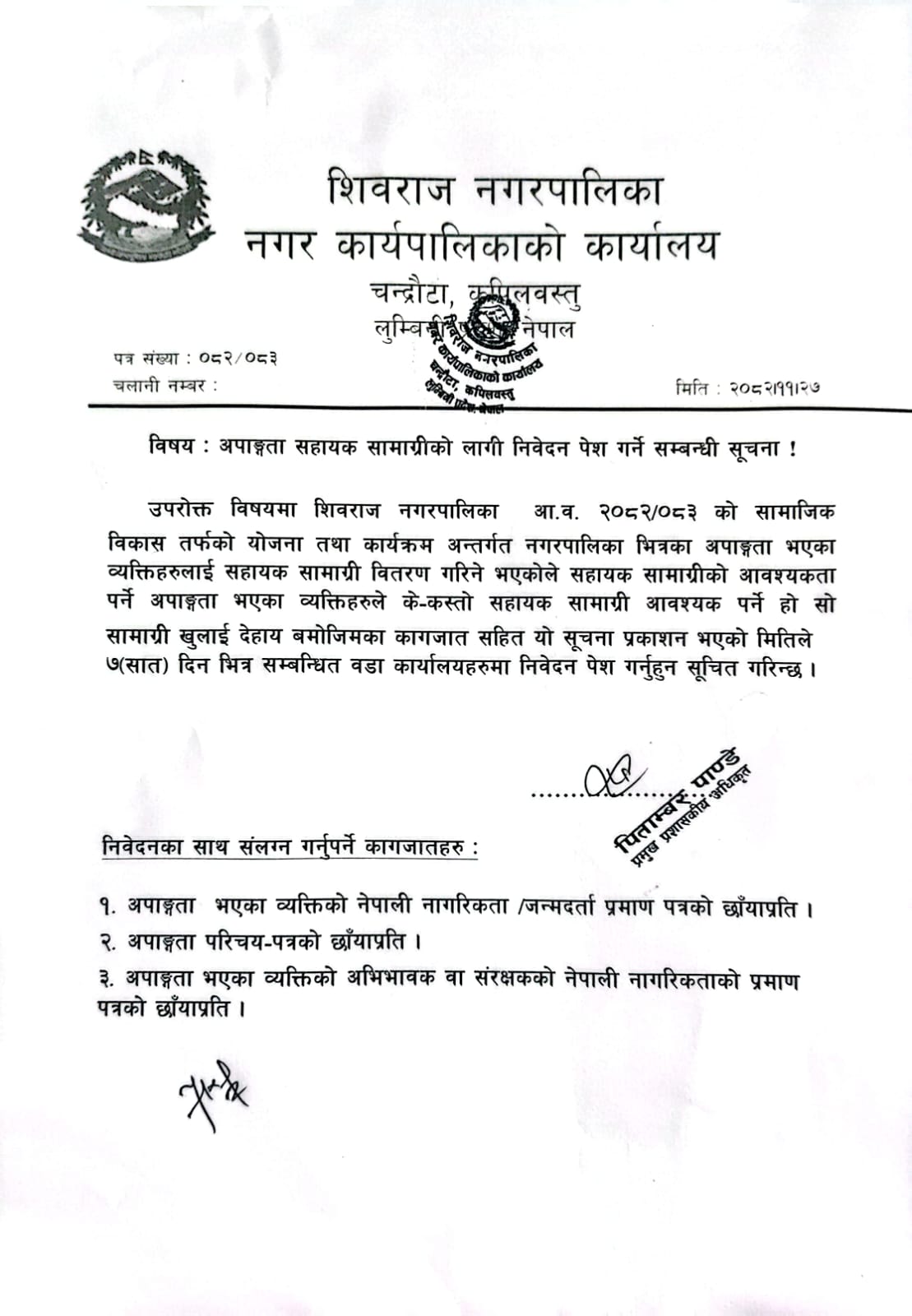अपाङ्गता सहायक सामाग्रीको लागि निवेदन पेश गर्ने सम्बन्धी सूचना।