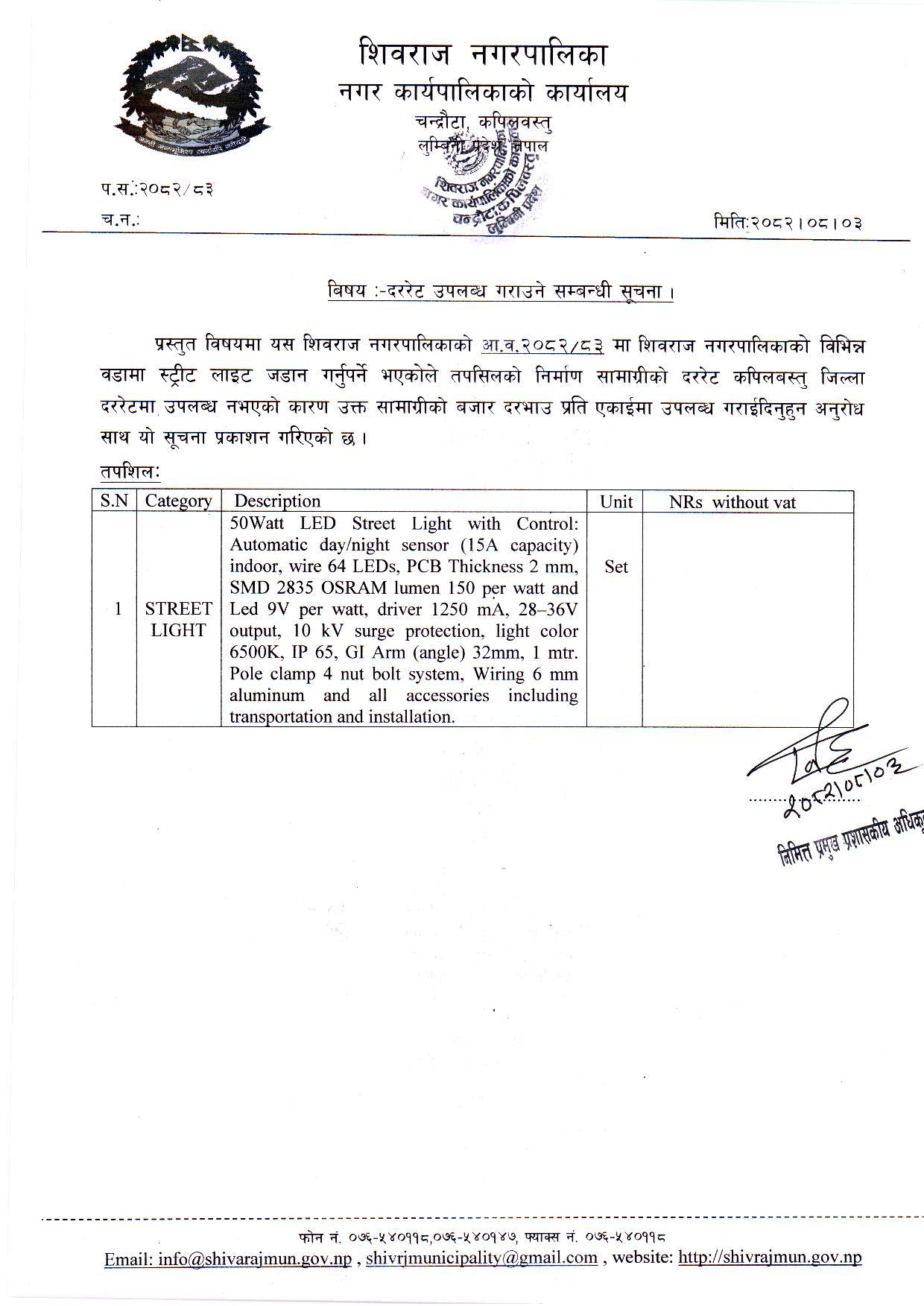 सरसफार्इ शुल्क संकलन र सरसफार्इ कार्य गर्ने सम्बन्धी शिलबन्दी दरभाउ पत्र आव्हानको सूचना