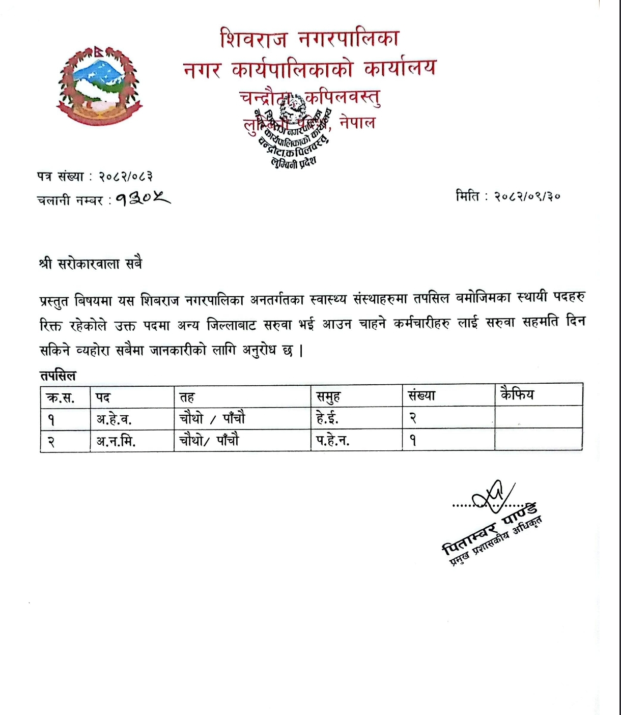 नियुक्तिका लागि सिफारिस गरिएको सूचना।