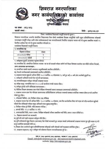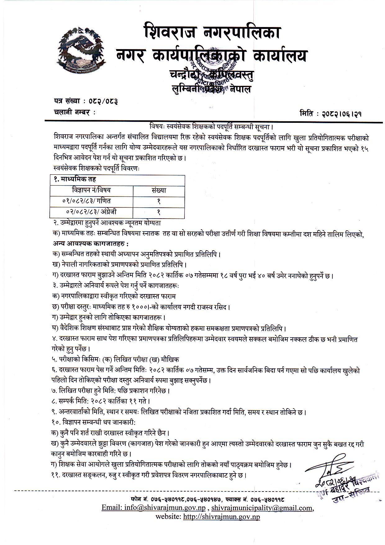 शिवराज नगरपािलकाले निम्न बमाेजिम स्वयंसेवक शिक्षकको बिज्ञापन प्रकाशन गरेकाे छ ।