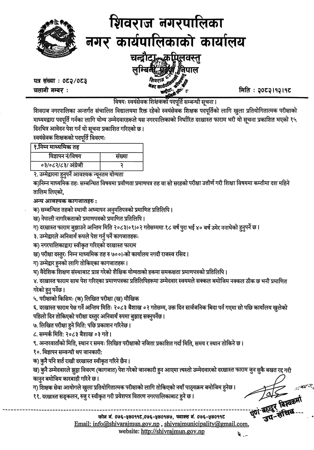 शिवराज नगरपािलकाले निम्न बमाेजिम स्वयंसेवक शिक्षकको बिज्ञापन प्रकाशन गरेकाे छ ।