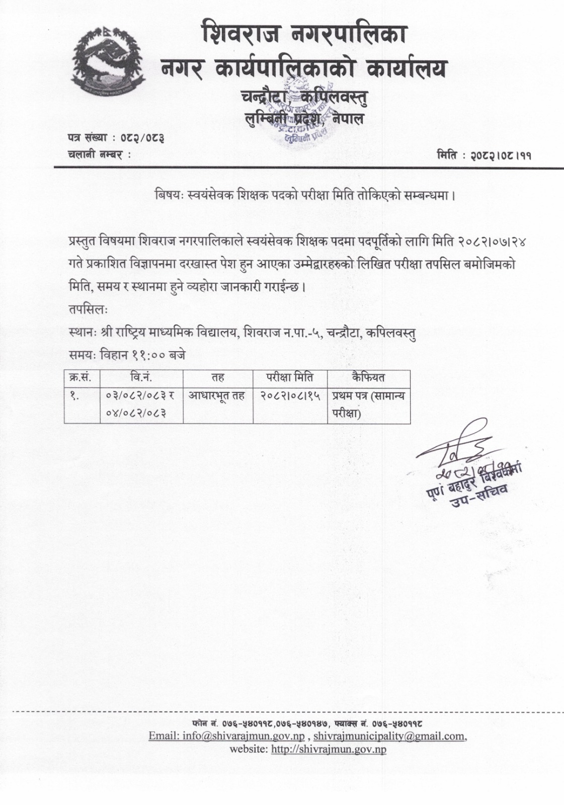 स्वयसेवक शिक्षक पदकाे परीक्षा मिति संशाेधन सम्बन्धि सूचना ।