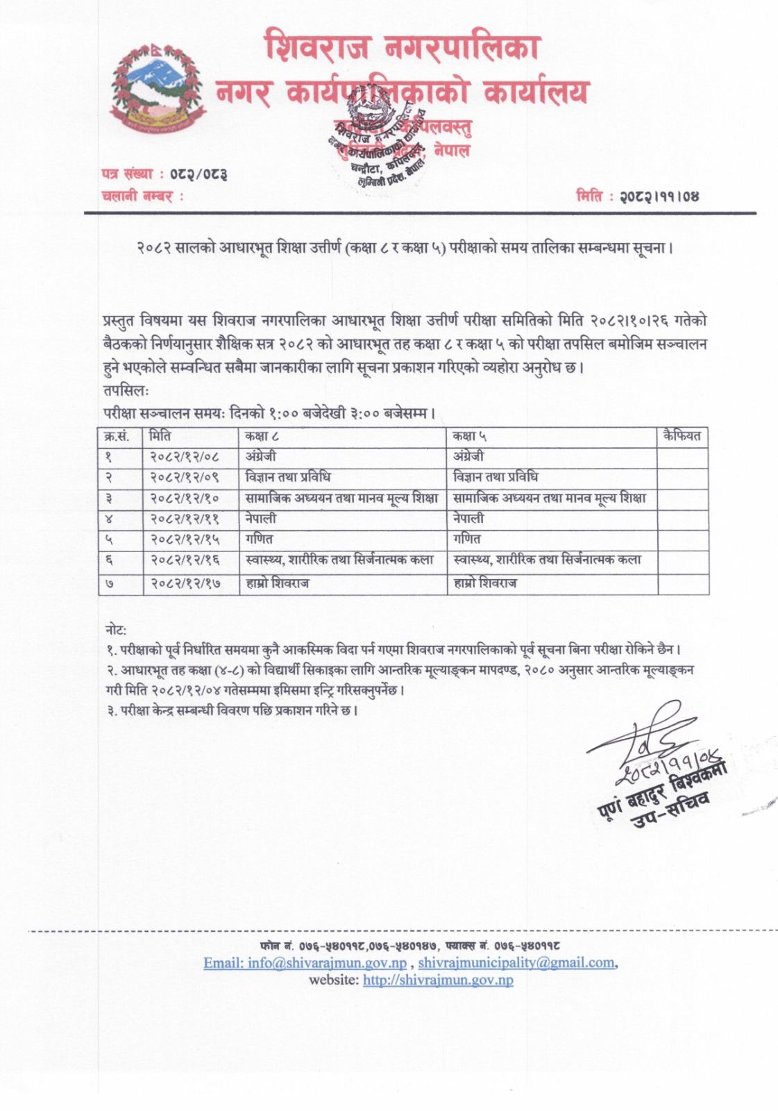 २०८२ सालको आधारभूत शिक्षा उतिर्ण (कक्षा ८ र कक्षा ५) परीक्षाको समय तालिका सम्बन्धमा सूचना।