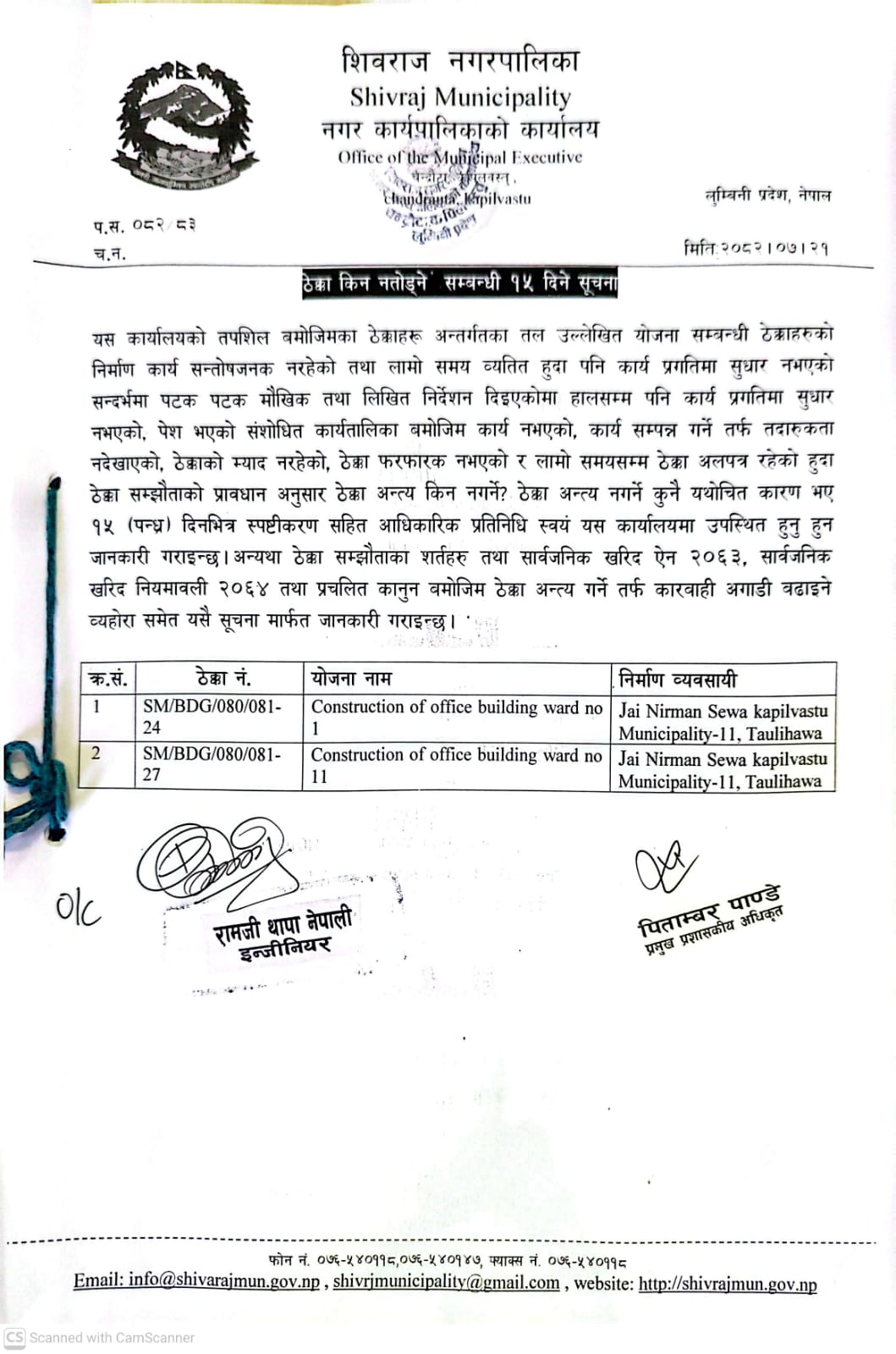 ठेक्का किन नतोड्ने सम्बन्धी १५ दिने सूचना।