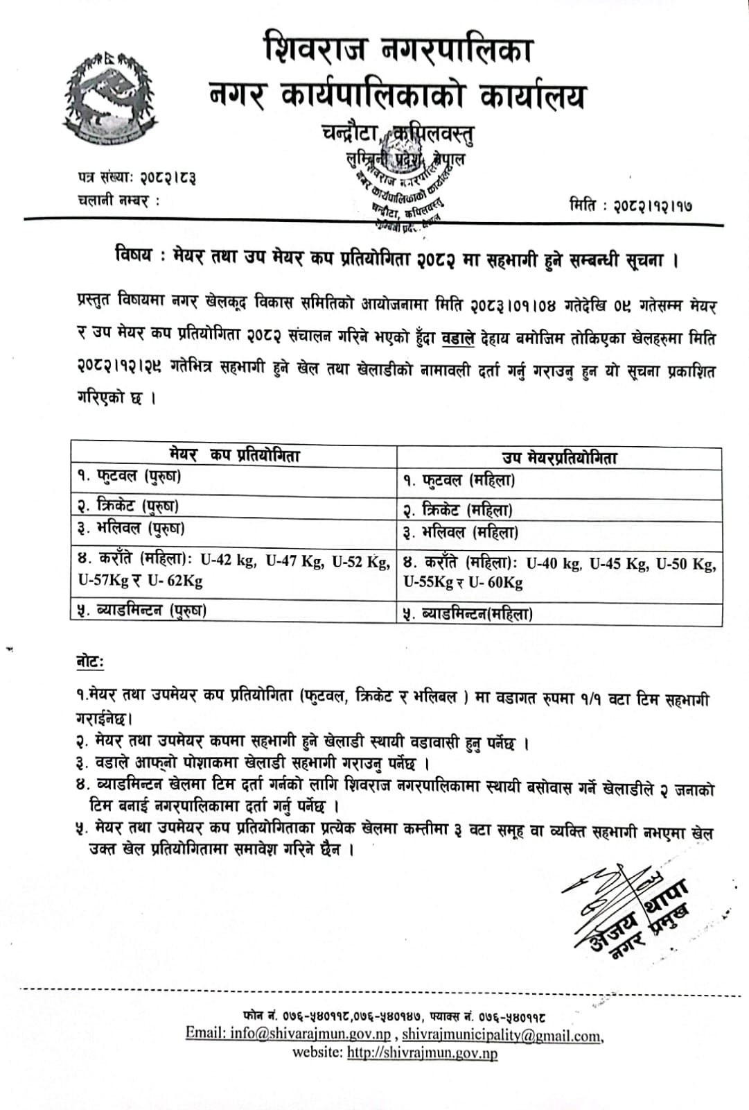 मेयर तथा उप मेयर कप प्रतियोगिता २०८२ मा सहभागी हुने सम्बन्धी सूचना ।