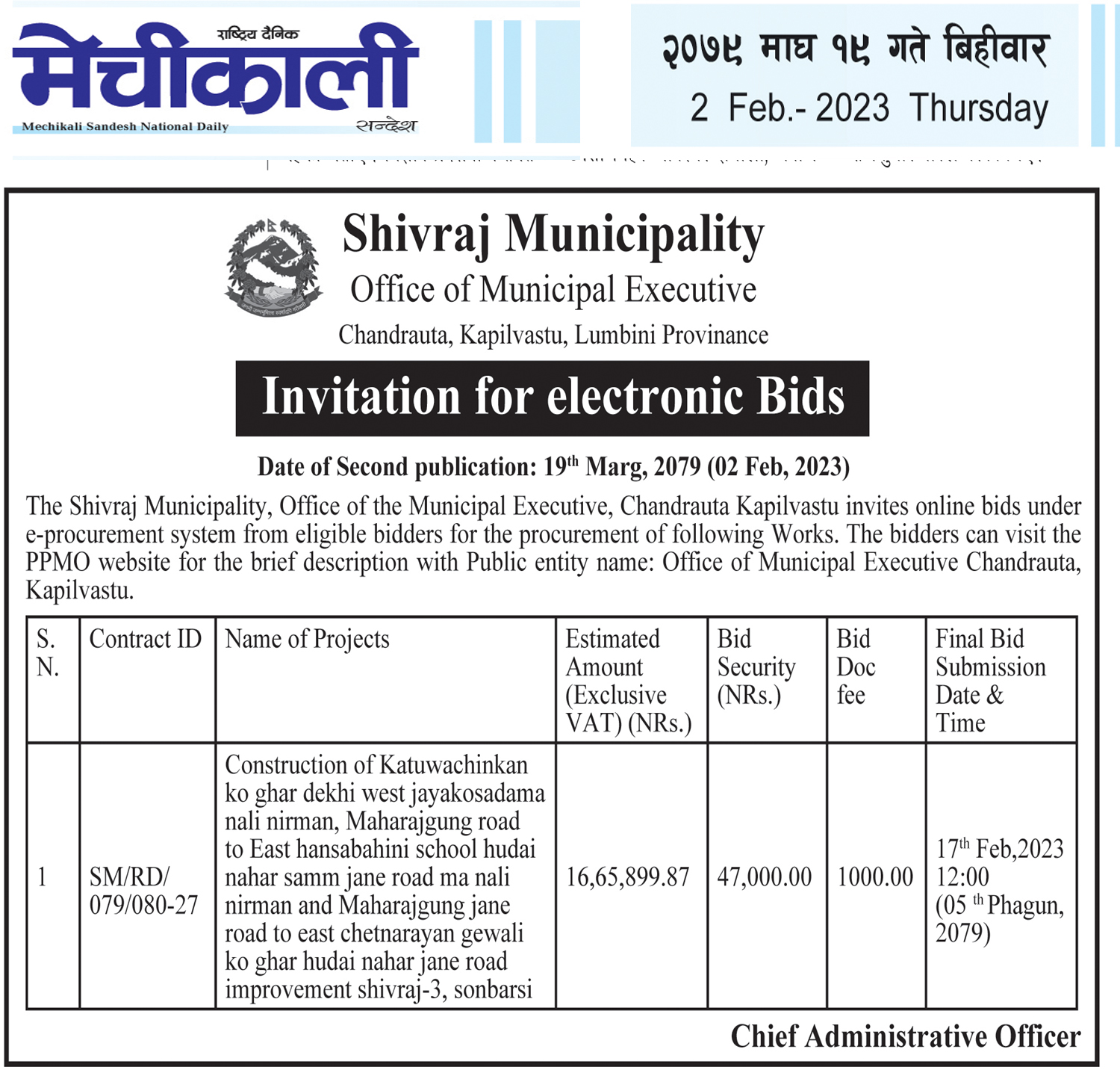 दोश्रो पटक प्रकाशित शिलबन्दी बोलपत्र/दरभाउ पत्र आव्हानको सुचना ।