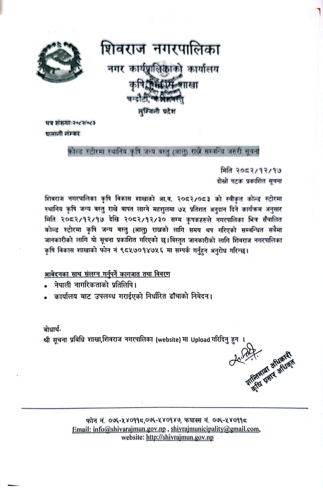 शिवराज नगरपालिका कृषि विकास शाखाकाे सूचना ! सूचना !! सूचना !!!