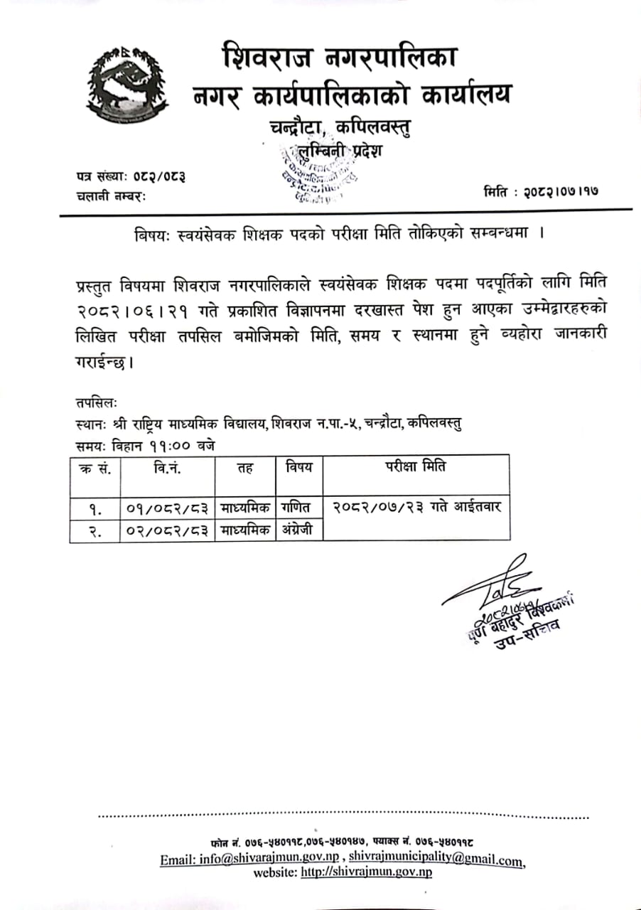शिवराज नगरपािलकाले निम्न बमाेजिम स्वयंसेवक शिक्षकको बिज्ञापन प्रकाशन गरेकाे छ ।