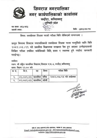 स्वयसेवक शिक्षक पदकाे परीक्षा मिति संशाेधन सम्बन्धि सूचना ।